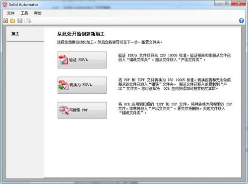 Solid Automator官方版是一款十分强大的PDF多功能转换器,在这款Solid Automator最新版之中还带来了全新的功能,每一个功能都可以为我们的用户带来不一样的使用感受,比如这款软件就支持自动化PDF/A的验证,并且还为大家提供了PDF 至 PDF/A 转换和可搜索 PDF 创建等功能,整个的使用过程十分的便捷,支持使用这款软件来观察文件夹或者是预定义设置自动化PDF工作流,即使是小白的用户你都是可以在这款软件之中去完成自己的操作。