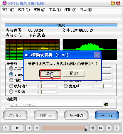 6、在录音完成后,点击“是”可以播放刚才的录音文件。