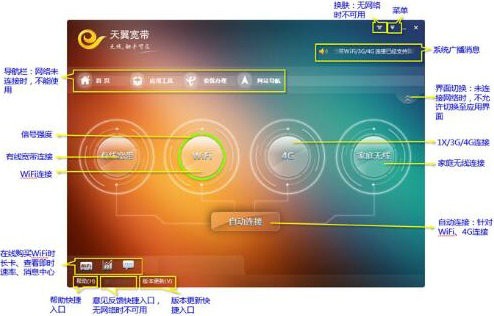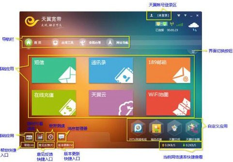 1.天翼宽带客户端覆盖中国电信所有网络接入(天翼宽带WiFi、天翼宽带3G、天翼宽带1X以及有线宽带ADSL);