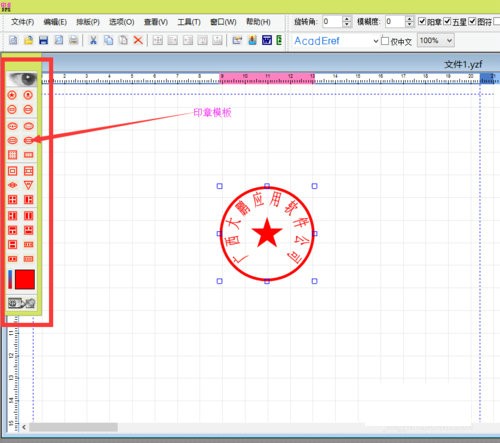 3、界面的左边是印章的模板,点击一个圆形印章,拖动到空白工作区;