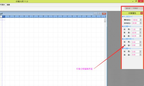 5、这里面都是以毫米为计量单位的,中心定位:在工作区的位置。主边框:印章边框。这些数据都可以改的。改好后,点击上方的中心定位,可以回到编辑主界面;