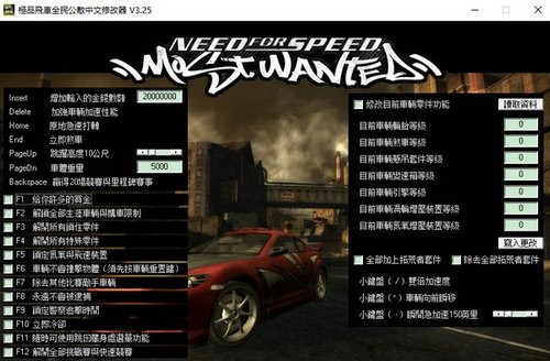 极品飞车9修改器绿色免费版是一款针对极品飞车9游戏打造的修改器,对于喜欢玩这款极品飞车9的玩家来说这款游戏修改器是绝对不能错过的,因为当你在使用这款修改器之后就可以更好的去完成游戏中的任务,给你一种完全不一样的极致游戏体验,让你在游戏中强到没有对手,游戏中你可以去增加输入的金钱数额、加强车辆加速性能、原地极速打转、立即刹车、跳跃高度等等,这些功能都有对应的快捷键,使用快捷键就可以快速使用。