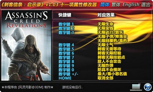 刺客信条启示录修改器风灵月影中包含了有无限生命、无限金钱、无限飞刀箭矢、无限子弹、无限士气、刺客无需等待、刺客无限经验、刺客无限技能点等待的功能,这些功能让玩家在玩这款刺客信条启示录的时候更加的简单方便,让你可以更加轻松的完成游戏中的每一个任务,而每一个功能的使用方式都很简单,每一个功能都有对应的快捷键,你可以通过点击快捷键的方式来使用这个功能,比如数字1就是无限生命,所以我们只需要按一下数字1就可以获得无限的生命。