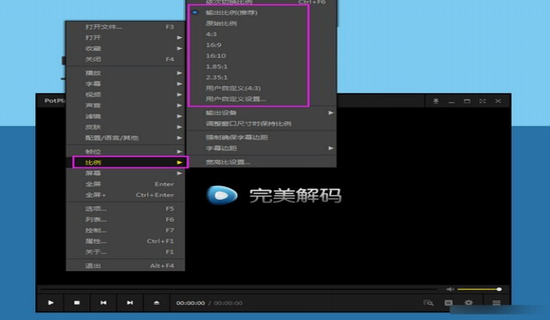 有些用户反映:在窗口模式播放的时候,视频不是铺满窗口的,这个显示比例该怎么设置?这个问题其实也很简单,具体操作为:界面上右击调出设置菜单→比例→选择你所想要的比例。
