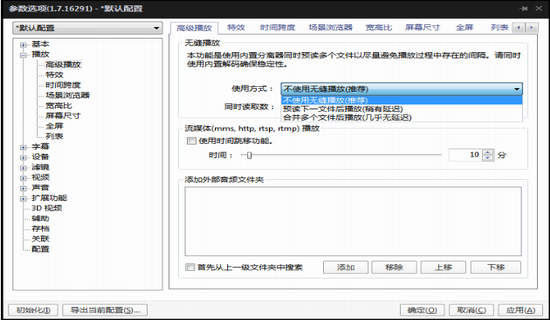 在打开的选项窗口中点击左侧的【播放】,在右侧界面中点击【高级播放】中的使用方法设置 “预读下一个文件后播放” 并确定。