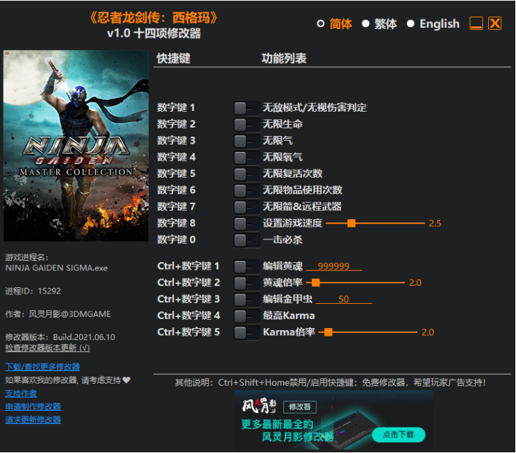 忍者龙剑传大师合集修改器免费版功能键位介绍: