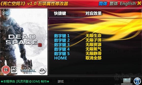 3、此时在游戏中按下死亡空间3五项修改器中显示的快捷键就可以使用对应的修改功能了。