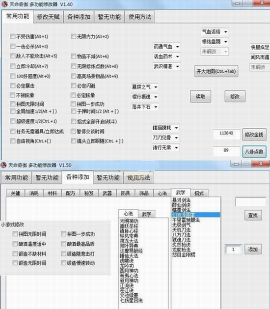 修改金钱、八卦点数、修改天赋、添加物品 秘笈 材料 图纸、武器、饰品、防具、心法、武学、招式。