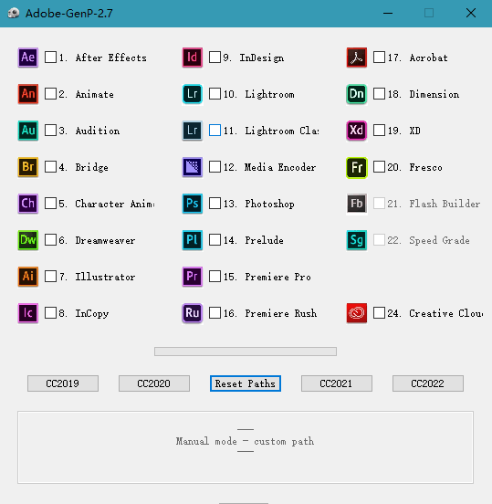 *支持2022测试版,2021正式版,修补以下Adobe 2019,2020,2021产品: