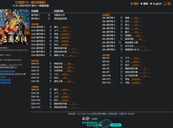 三国志14威力加强版修改器3dm版是专门针对这款游戏制作的游戏辅助,修改器界面简洁明了,使用方便快捷,玩家只需启动游戏打开修改器即可,玩家可根据自身的需求进行修改属性,利用该修改器玩家可以修改无限命令书、耐久、士气、士兵、人口等四十一项功能,帮助你获得更好的畅玩游戏,但小编还是建议玩家们适度修改,以免丢失游戏体验。有喜欢这款游戏的玩家那么千万不要错过这款修改器,快快到本站下载体验吧。