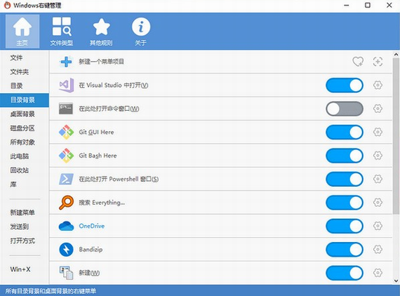 1、启用或禁用文件、文件夹、新建、发送到、打开方式、自定义文件格式等右键菜单项目。