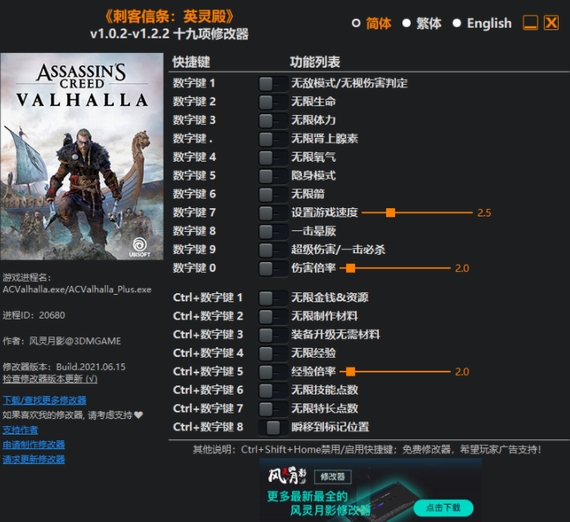 刺客信条英灵殿修改器最新版说明: