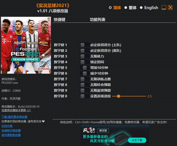 《实况足球2021修改器风灵月影版》是一款专门为同名游戏而制作的中文绿色版游戏辅助修改工具,该修改器的功能十分的强大,并且在玩家使用起来也是非常的便捷又实用,完全能够让玩家一键实现开启增加10分钟、锁定时间、无限薪资预算以及必定获得得分(客队)等八项的功能,这样就可以为玩家大大的降低这个游戏的难易程度,从而让玩家可以更好的拥有十分舒适的游戏体验。