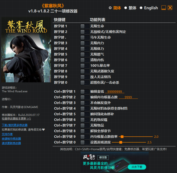紫塞秋风修改器风灵月影版界面描述: