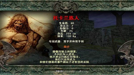 游戏允许玩家选择4名英雄,分别是亚马逊人、侏儒、野蛮人、骑士,每一个角色都具有其独特的战斗特性。亚马逊人是个MM,动作最敏捷,但是攻击力量不强;侏儒力量是最强的,但是行动也是最迟缓的,且容易疲劳;骑士是比较中庸的角色,所有属性都比较平均,当然也就不会很强;野蛮人是力量与速度的完美结合,但是防御能力就比较欠缺了。选择不同的角色,游戏初期的环境和任务也各不相同,而且还将会影响到剧情的发展,增加了游戏的耐玩度,因为你想感受所有不同的游戏性,就得把每一个英雄都玩一遍。