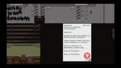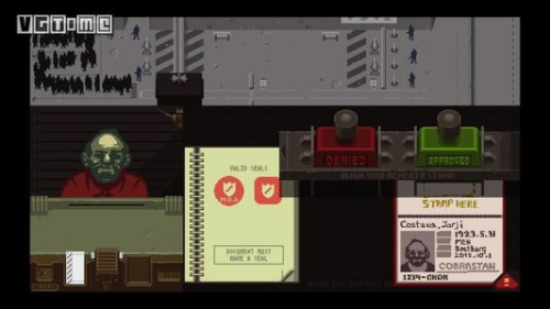 请出示文件中文版是由游戏厂商3909制作发行的一款非常另类的策略类(SLG)游戏,游戏界面非常简单质朴,上半部分是边检站的俯视图,左边长长的人群就是等待入关的NPC,下半部分左侧是检查窗口,右侧是玩家的操作台,用于查看证件、对比资料以及盖章,如此魔幻的设定,放在冷战背景下倒也有几分真实。背景设定在80年代冷战时期,玩家扮演一位在虚构的共产主义国家阿兹托卡中新上任的边界关卡检查官,负责审核确认入境人士的证件,而标题“Papers, Please”即主角面对每一位入境者惯用的开场白。整个游戏共有20个不同结局,其他结局包括受贿入狱、叛国被处死、家人病亡等等,感兴趣的可以下载来玩一玩!