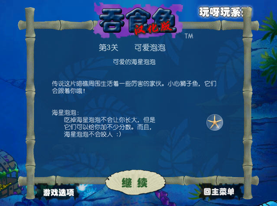 河豚鱼(部分关卡出现):在它鼓起来的时候别去碰它,否则只有扣分的余地,而且小鱼还会被尖刺弹开。不过从它背后袭击倒是个不错的主意。