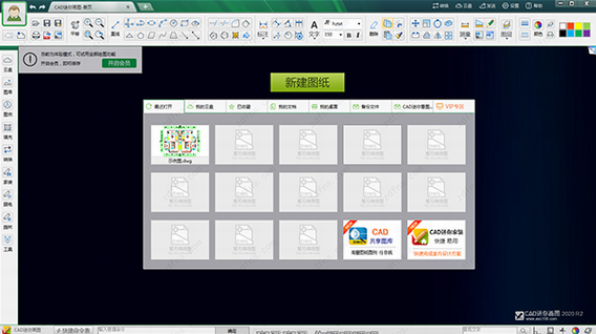 1、下载安装完毕后打开该软件,如下图所示,上方菜单栏里有操作的功能按钮,CAD软件上基本画图功能这个软件上都有,正上方位置有【新建图纸】功能选项;