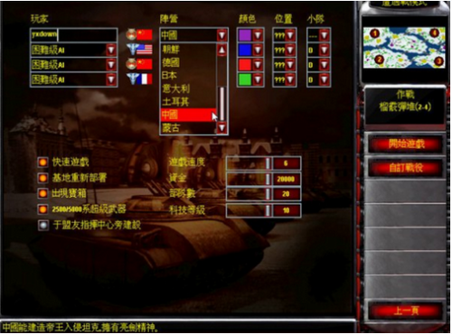 3.神龙最大的特色之一就是一国一特色(赛宁你真生猛。。。),每个国家都有初始的某种加成(尼玛的飞机造价打五折,尼玛的建筑血量加四分之一,尼玛的单位火力提升百分之二十!)。此外南洋联盟的空中装填技术、731虐步兵的酸爽和欧盟的冷冻技术都是极好的