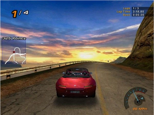 3、HELICOPTER ASSISTENCE(直升飞机援助),玩到这里,让我想起以前我一个朋友的朋友开着一辆斯巴鲁在高速上狂飙了几百公里,最后还是被直升机拦下来的,呵呵。不过这里,直升机被称为DROPPER,会往下扔炸弹的。不过是个汽油桶,但是被时速几百公里的车撞一下也够要命的。超速的车辆只要中了一颗,HP马上掉一半,你再蹭一蹭它,它就服了。同上,不要自己中了炸弹,要不然哭死你。