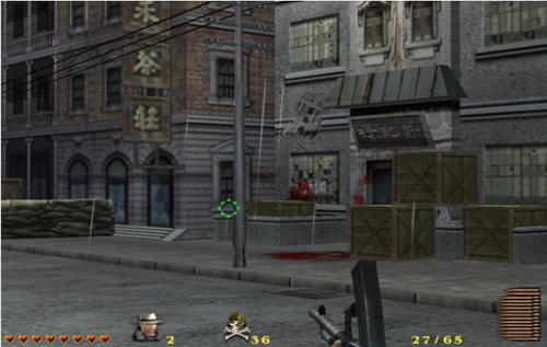 一出场就面对一群赶来抢夺的鬼子,这里要注意镜头转换后,要把那胖子解决,不然鬼子会一直冒出来。向右拐,左右防护栏里面各有几个敌人,大街上的不好对付,浪人会向你冲来,鬼子在后面拿枪射击,先将后面的鬼子干掉,然后再解决浪人。拐进巷子后,一枪把汽油桶打掉可以先干掉一人,继续往前走,同样是浪人和鬼子一起出现,还是先打鬼子。再前进将第一次遇到自爆兵,这个家伙威力相当惊人,绝对不能让他近身,边上一个手榴弹手,左边屋顶有几个鬼子,这里先一枪点掉自爆兵,马上左移干掉楼上的人,然后把飞在空中炸弹打掉,顺手把扔炸弹的家伙打死,再到左边楼上解决其他鬼子。进入巷子鬼子离得比较近,楼上和屋顶的鬼子和浪人,左转后的敌人都不少,这里要先打拿枪的鬼子,然后打空中的手榴弹,剩下时间打扔炸弹的人和浪人,以及那个胖子。