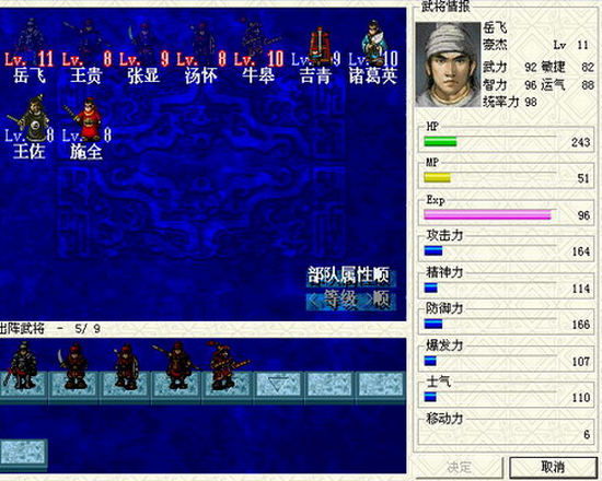 游戏引擎取材于《三国志·曹操传》,游戏人物参数数据则是参照《说岳全传》的剧情中人物的表现进行的综合评价和设计,因游戏需要,不一定符合史实,大部分游戏剧情忠实于《说岳全传》原着,过关设计耐人寻味,关卡设计难度较大,多种隐藏道具,隐藏关卡, 结局 对喜欢战棋游戏的玩家有着不小的挑战和乐趣。