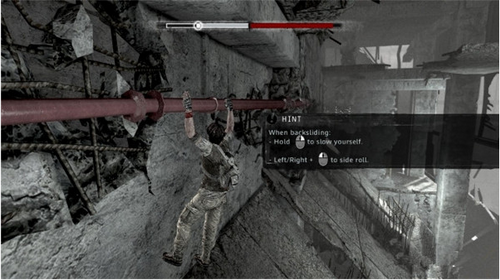 体力条设定:游戏中的最大亮点也是最大的难点,玩家能获得的补给资源是非常稀少的,在不断的攀爬中,不仅动作笨拙而且还要耗费体力值,当体力耗尽,我们就要拼命的狂按RT键来叫主角休息,代价是体力上限的一点点减少,不得不说这是个不错的创意,合理分配物资就显得非常重要了。