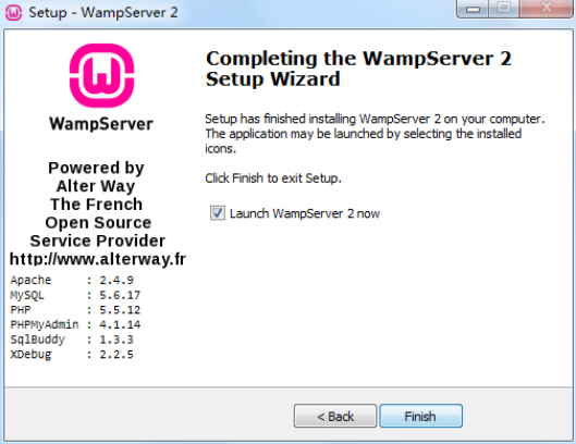 5、Wamp Server安装完成,您可以勾选“现在运行Wamp Server软件”点击【finish】会自动打开软件。