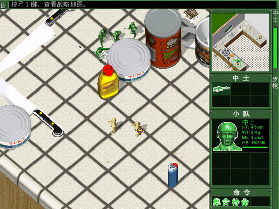 如果你想增大游戏可见地图的尺寸,可以去掉地图右侧的命令栏,只要点击屏幕最右侧的竖条(即有中士体力值的那条),命令栏就会消失,再点击一下竖条,命令栏就会复原。