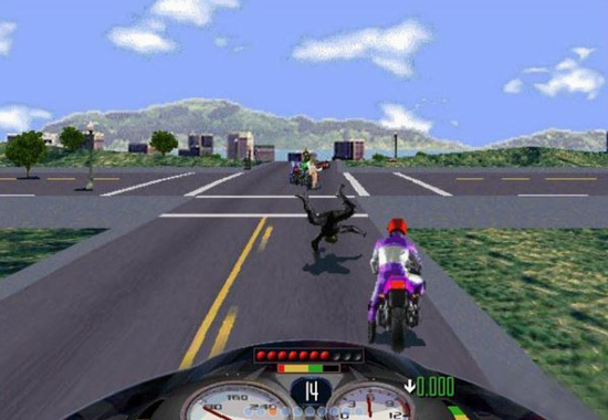 7、用拳击别人。跑的距离近时,也可以用拳击,将对方打到边上,他的摩托碰到建筑物后,就会倒下,有时系统也会给你木棍或铁鞭,当你拥有木棍或铁鞭后,有时在与对手激烈的打斗中你手中的武器可能会被对方抢走。