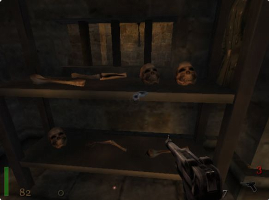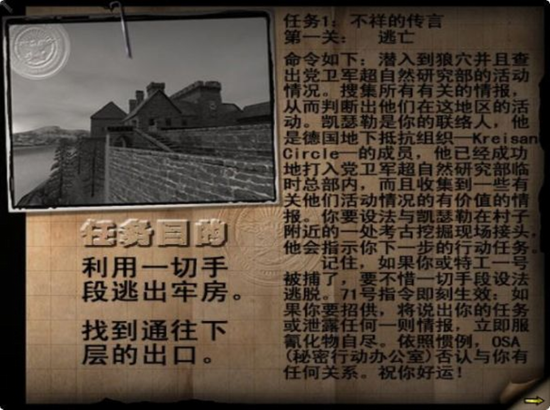 游戏一开始杀掉守卫后从牢中逃了出来。将守卫的手枪捡起,这是主角一开始唯一的远程射击武器。从监狱出去,然后上楼梯来到电刑室,里面的医生刚将主角的同伴杀掉,杀掉他后从电刑室右边的门出去。没多久就可以看到一个通讯室,里面有几个士兵把守,通讯室的门需要按门旁的按钮来打开,进去后在墙角的武器架上取得武器然后干掉敌人。接着向前走,上楼后通过外面的走廊来到城堡的另一边,杀掉守在圆环形楼梯处的敌人,这时候警报很可能会响,不管它,顺着圆环形楼梯来到最顶层,杀掉顶层守卫的士兵,然后在门口等待追兵上来,干掉追兵后在楼顶的天台上找到一个用木板盖着的地方,打烂木板跳下去。跳下去后注意先杀掉窗户对面拿步枪的敌人,然后在这间屋子内补充弹药和生命,还有别忘了拿走桌子上的望远镜。墙上有个警报器,可以关掉它把警报解除。从窗户跳出来,然后去刚被主角杀死的士兵那里,拿走步枪后向右走,打开前方的门,不过不要冲进去,因为地板下方会有一阵非常猛烈的扫射。杀掉屋内的敌人然后杀死破烂地板下面的敌人,从地板的破洞跳下去。来到一间有几个盔甲铜像的屋子,在这间屋子右边的通道里有两个门,依次杀死两个屋子的所有敌人,从左边屋子进入最里面的走廊,前方就是本关的出口。