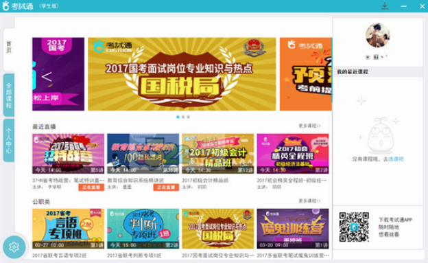 《考试通官方版》是一款功能实用性很强的考试学习工具,这款软件资源丰富、视频直播课程、题库、资料库、全面又权威!还包括学习资料、考试习题、名师讲解等,帮助考生顺利通过考试,是各位备考生的必备武器,考试通电脑版还能够模拟考试氛围、在线课堂、名师一对一指导辅助,让你提高学习效率,提高考试成绩,该软件里面的部分课程直播可以支持回看功能,一堂课没有听懂,你可以在课后反复的进行观看学习,有了这款软件,职业考试方面不需要再为挂科而烦恼了。