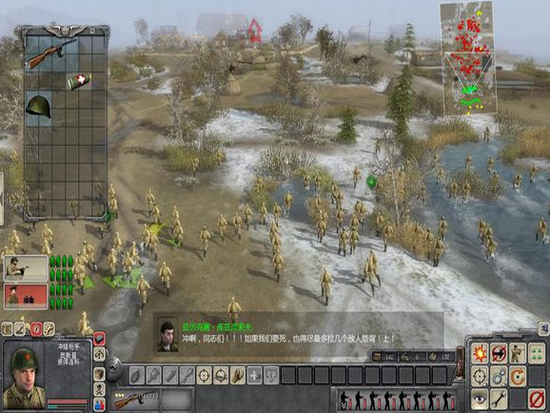 这是场面十分火爆的人海rush关,可以欣赏到苏军的人海战VS对德军的装甲精英战的精彩对决。本关开始给你很多兵,可能在控制上会有点乱,注意分好队,不要一起冲,记住保存有生力量。然后在呜拉声中,冲锋开始了。先让友军在前面冲锋吸引火力,你在后面用零打碎敲的战术把敌人的机枪点和火炮阵地一一拿下。先拿下地图左侧山头的一门火炮,然后移动到合适位置对准敌军的中央阵地炮轰,拨掉火力点和装甲车辆。接着拿下右侧的敌人的火炮阵地,最后突破敌军中央阵地,右侧有一辆坦克可以修好使用。