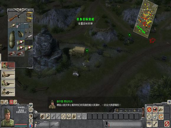 打灭探照灯并消灭敌人,占领小岛的西侧,派人坐上四联装机关炮,再叫一名士兵用反坦克手雷把机关炮的前方掩体炸开一个缺口(否则机关炮无法向远方射击)。将机关炮对准隔岸码头的碉堡和装甲车扫射,一通很爽的扫射后,基本上将码头上的敌人消灭干净,为登陆省下很多事。然后游到这个码头上,悄悄地用反坦克雷摸掉边上的一辆轻型坦克,向前夺下设在山口的一处机枪阵地,把附近的敌人消灭干净,不远处的前面就是那个号称最难找到的电焊机(电焊机在有人的情况下会一直闪火花,在地图的最西方,很容易找到)。稍作整装后,杀向停放潜艇的码头,用火箭筒干掉对面的两辆装甲车,派人上潜艇操作两门大炮,把闻讯而来敌人援军干掉。这时会不断有任务提示:要你占领地图最上角的一处房子,夺下房子后会有援军给你;另一个是要你切割潜艇舱盖,你让人把远处的电焊机拖到潜艇上切割;切割了一会儿,又提示要你到艇尾正对面的发电站把电力开关启动。这之间还要和敌人的增援力量进行战斗,很是紧张和刺激。经过一番苦斗,潜艇舱盖终于打开了,潜艇会自动发射鱼雷把闸门外的增援船炸得飞上天(正好切合飞翔的德国佬的关卡名),苏联关至此结束。