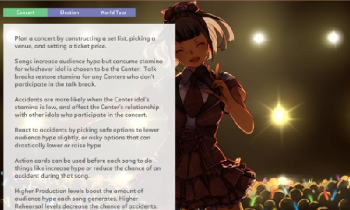 你将在一家规模不大(正在成长)的偶像经纪公司担任经纪人。负责培养新一代的年轻偶像,由你决定雇佣谁、解雇谁,在适当时提拔谁、责备谁。这些年轻爱豆的私生活是你事业的一部分,而他们的生活并不总是快乐。他们获得的成就可以给你带来成功,同时八卦丑闻也会给你的公司招来麻烦。