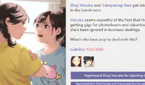 除此之外玩家在游戏中还要重视事务所内偶像之间的人际关系,必要时要介入调和纠纷,还要考虑不同个性的偶像之间的组合搭配,如果发生内讧欺凌等事件的话玩家介入的时机也有讲究。