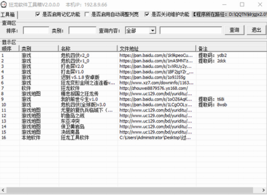 《狂龙软件工具箱官方版》是一款非常好用的杂类工具,它的页面简洁,功能强大,这款工具箱功能强大全面,简单易用,使用后可以给用户提供很大的帮助和便利,可以帮助用户进行常用软件或游戏地址的保存,可以对内容进行查询,使用起来十分便利,这款工具箱功能强大全面,简单易用,使用后可以给用户提供很大的帮助和便利,如海量数据存储,还可根据用户的喜好自动记忆所输入内容,双击列表内容可直达软件下载界面,常用的软件分类存放等功能,方便查找。