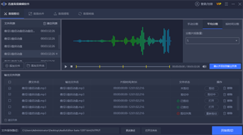 答:在软件中,有三种分割的方法:时间分割、平均分割和手动分割。平均分割是将音频平均分割成两段;时间分割可在确定一个时间长度后根据这个长度将音频分割成几段;手动分割则是自己添加指针调整需要分割的音频片段。