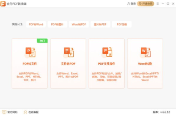 1、最全面的转换模式:截至目前为止,金舟PDF转换器已经具备了最为全面的PDF转换模式,全面支持多种不同文件格式之间的转换,包括PDF转Word、PDF转Excel、PDF转图片、PDF转PPT、PDF转换HTML、PDF转TXT、图片转PDF、OFFICE转PDF。