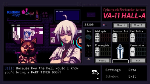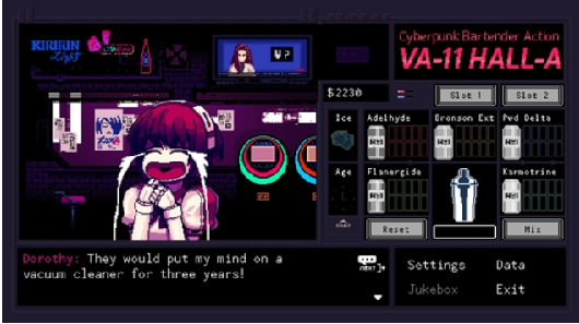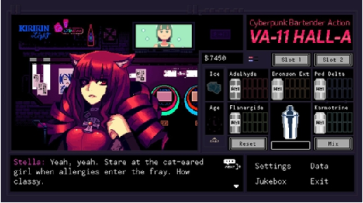 赛博朋克的都市:这是一个赛博朋克的反乌托邦Glitch City,玩家将扮演名为VA-11 HALL-A的一位调酒师,在酒吧见证这个赛博世界的日常故事。