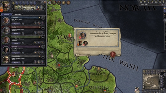 从游戏性的角度来说,局部区域的地图可以让游戏集中深化玩法和细节雕琢,游戏里不同的文化、宗教和政体都有自己的特色玩法和机制。十字军之王3刻画一个国家内部的矛盾和斗争,引入了封建制体系,小到一地伯爵,大到帝国,都有自己的内部事务需要处理和经营。而且和欧陆风云不同的是,这种内部事务不是给个单纯的数据限制,玩家作为上帝置身于外选择数据最优解。玩家实实在在参与到内部斗争中,很多选择不是单纯的数据优劣,需要考虑多个方面的因素。游戏的君主和宫廷的财政能力影响直辖上限,超出部分也要委任统治,但玩家需要考虑派谁过去治理,人物的能力和性格影响治理的效果和与你的关系。将土地分封出去确实也会降低税收和提供的兵员,但封出去的封臣有自己的想法和行为,封臣会自己投资建设,如果你帮忙投资可以提高好感度,在边疆封一个忠诚的封臣会自己领兵御敌,还会主动对外扩张,在国内他也会支持你的主张和政策。但一个不忠诚的封臣也会有自己的算盘,他可能要求加入内阁,不忠诚时交税会变少,甚至可能主动发起派系和叛乱。在游戏中,除了最高领主,玩家也可以扮演下面的封臣,可以选择内部做大当权臣乃至取而代之,也可以效忠君主勤王。玩家有了各种生活玩法,不像传统大战略那样只能对外扩张,这一点也丰富了游戏玩法路线。
