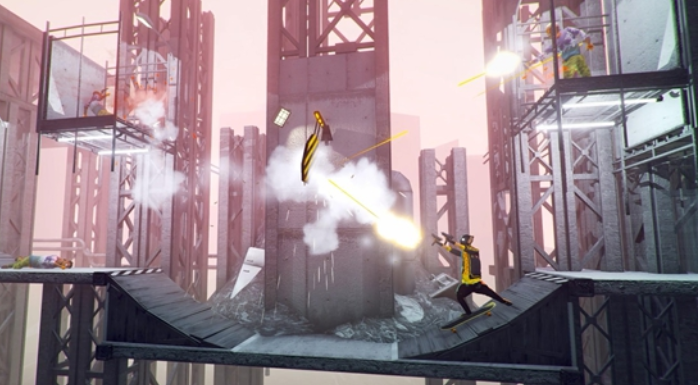 玩家可以操控角色跳跃的过程中进行旋转,在旋转的同时开枪射击。