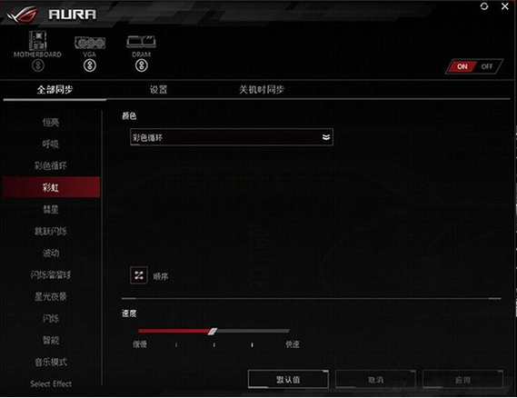 颜色循环(Color cycle)或者称为色相环,是一个直接设置全部区域的效果,不能设置速度和循环方向等参数。也是这款主板在默认情况下的光效。