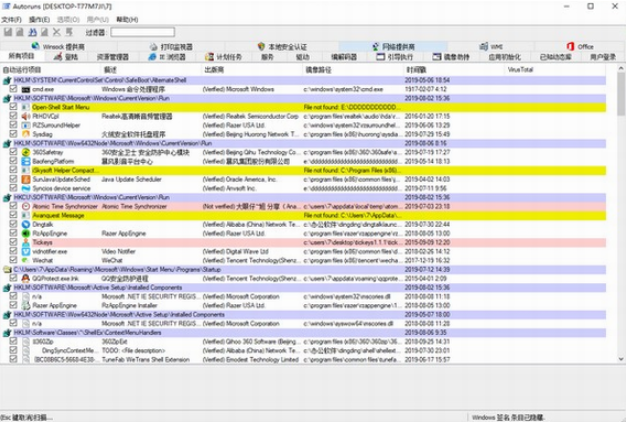 《AutoRuns中文版》是由微软 Sysinternals 公司出品的一款精品小工具,它能显示 Windows 启动或登录时自动运行的程序,并允许用户有选择地禁用或删除它们,例如,那些在“启动”文件夹和注册表相关“键”中的程序,此外它还可以管理包括:Windows 资源管理器 Shell 扩展(如右键弹出菜单)、IE 浏览器插件(如工具栏扩展)、系统服务和驱动、计划任务、镜像挟持等多种不同的自启动程序,软件可以修改系统服务、驱动程序,编辑引导执行程序,控制用户账户,配置IE浏览器,还能关联解码组件,功能非常强大,不仅可以对各启动项目进行管理,还能直接修改注册表文件。