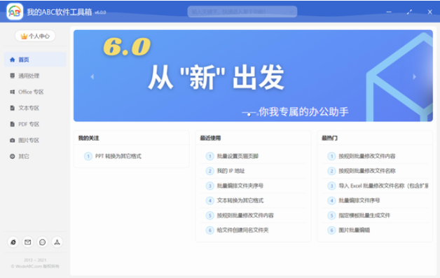 1、在本站下载解压,双击“.exe”文件即可打开我的ABC软件工具箱破解版,可以看到通用文件处理、office专区、pdf专区、图片专区、其他等功能。