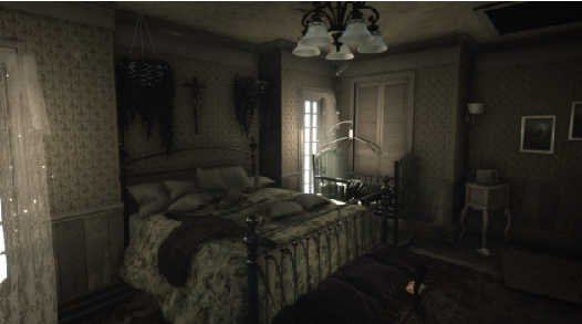 在以室内为主环境的独立恐怖游戏中本作比较直观的优点在于画面不错,各种贴图、模型等还算精细并且内容丰富多样,有各种各样的家具家电、锅碗瓢盆、男女洗护、笔墨纸砚、名人字画等居家相关的物件,且在物与物之间和物与环境之间的比例与空间比例表现协调、自然,不像其他大多数独立恐游中出现的诸如一个傻大的房间就一张床一把椅子其他什么也没有,或由于贴图模型过少而导致的室内环境非常单调等情况。