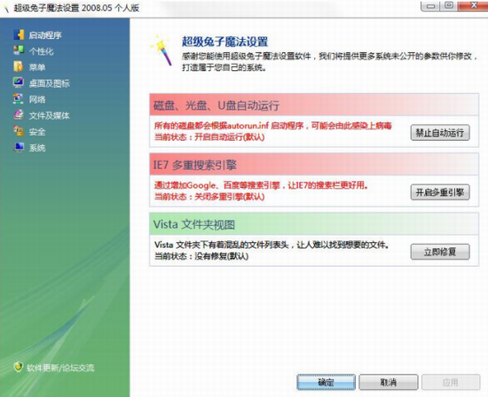 《超级兔子魔法设置官网版》是一款拥有超过10年的电脑功能辅助软件,超级兔子魔法设置可助用户轻松辨别硬件的运作状态、安装硬件的驱动程式、监测危险程序的软件,超级兔子进程管理器具有网络、进程、窗口查看方式,同时超级兔子网站提供大多数进程的详细信息,是国内最大的进程库,超级兔子安全助手可能隐藏磁盘、加密文件,超级兔子系统备份是国内唯一能完整保存Windows XP/2003/Vista注册表的软件,彻底解决系统上的问题。