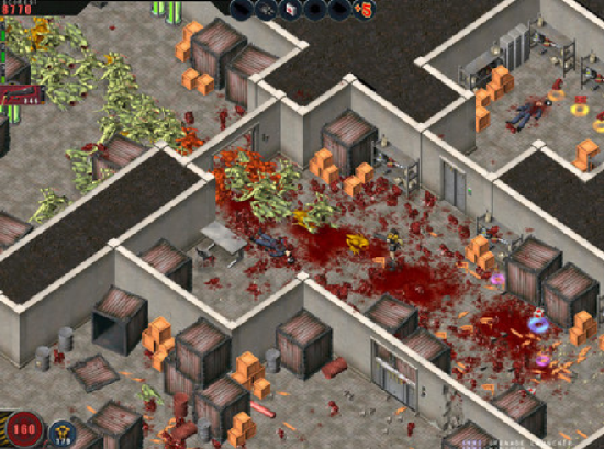 这是一款斜45°角的第三人称动作射击游戏,游戏的主要场景在黑暗阴森的军事基地里,这里已经被各种各样恐怖的怪物所占领,你必须拿起武器,勇敢的消灭血腥的怪物,才能取得最后的胜利哦。游戏分两种模式,过关模式和时间模式,游戏中可以获得MONEY,用作下一关购买更好的武器弹药,也可以用来升级你的能力值。操作方法:W S A D为上下左右,1-9换不同的武器,鼠标左键射击,按右键也可以行走
