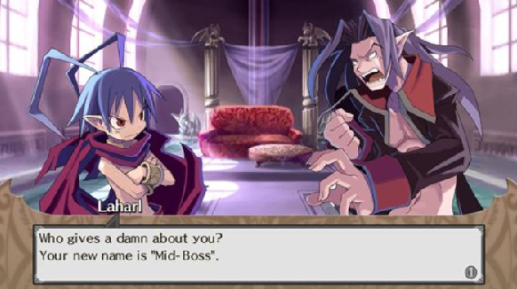 拉哈鲁:本作品的主角。魔王克里切夫斯科伊与身为魔女见习生而来到魔界学习的人类母亲之间所生的半恶魔。在父亲死后,以继承魔王为目标。年龄为1313 岁,是主要角色的三人中最年轻的。在游戏刚开始时的个性十分的自我中心、任性妄为、冷血,拥有与魔王儿子的身份十分相配的个性。非常讨厌爱、温柔、光明与 积极之类的话语、以及大胸脯的女性(弱点......)。之后,游戏中提到拉哈鲁如此的否定爱的原因是出至于母亲的死。由于与芙蓉的相遇,而开始展现出身为王者的度量及和善。 拥有着非常强大的力量,能以一人之力将侵入魔界、超过200万人的宇宙大舰队歼灭(而且是在手下留情的状态下)。(此为BAD END之一)最后因帮助芙蓉重生,变成了一只普利尼(变成普利尼后还戴着芙蓉给的项链)。