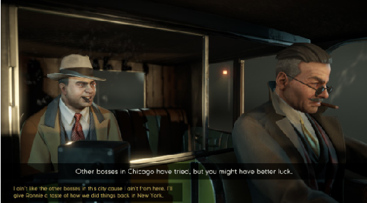鲜活的世界:探索20世纪20年代芝加哥生机勃勃的街道,与一系列鲜活的角色互动。你可以根据每名角色的人生经历判断他们会对你的行为(或不作为)作何反应。你可以选择闲谈、强迫、勾引、威胁或杀死他们的方式达到目的。